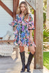 Jaase designed Tropics Betty dress.  Bright and tropical print with black lace detail on wide sleeves.  Frill bottom on dress with length at back slightly longer than front.  4 button to v neckline and collar.  100% Rayon.