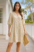 The natural beige-and-white print brings a warm, modern touch—perfect for pairing with slides, sneakers or a woven tote for your everyday coastal look. Side pockets give you effortless practicality, while the billowy sleeves and floaty skirt drape beautifully on all body shapes.