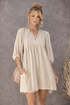 Effortlessly chic and oh-so-comfortable, our Rayah Dress in beige is the perfect addition to your wardrobe. Made from 100% Rayon, this soft, flowing dress features a tie at the neck, puffed sleeves with banded cuffs, and a flattering knee length. The chest bib adds a touch of style to this versatile piece. Elevate your look with our Rayah Dress!  Also available in Khaki.